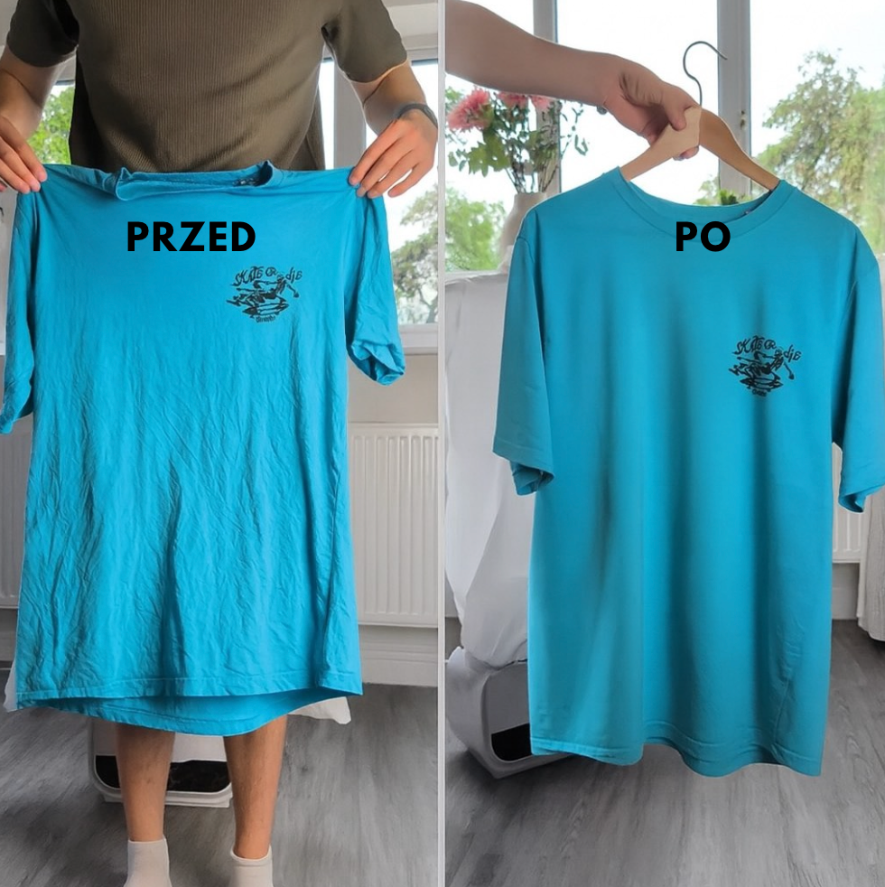 Dla najlepszych rezultatów koszula powinna być lekko wilgotna. Zalecamy używać jej prosto z prania – ewentualnie delikatnie spryskaj ją wodą z butelki ze spryskiwaczem, gdy jest już założona na maszynę.